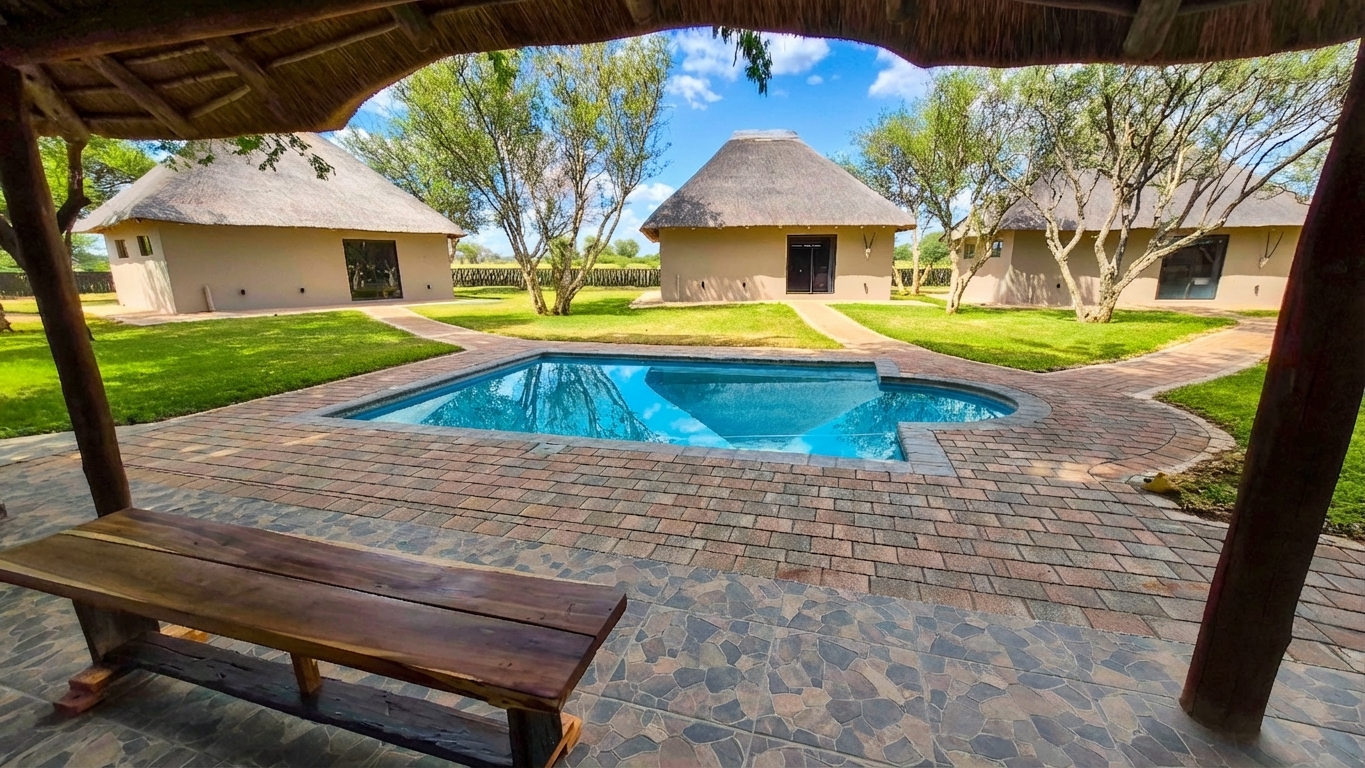 When management tweaks this page, the spine stays: four chalets only for sleeping, shared bar and kitchen, full board including the bar, pool, canopy boma, outlook and waterhole, clay and drives, P3 permit callout, safes and cold room, professional meat and hide handling, taxidermy via your contractors, and Matlabas on the perimeter. Swap photos and booking fine print, not the facts.